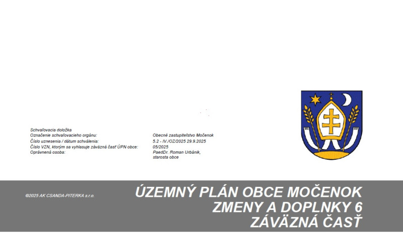 V prílohách môžete nahliadnuť do schváleného a platného Územného plánu obce Močenok - Zmeny a doplnky č. 6.