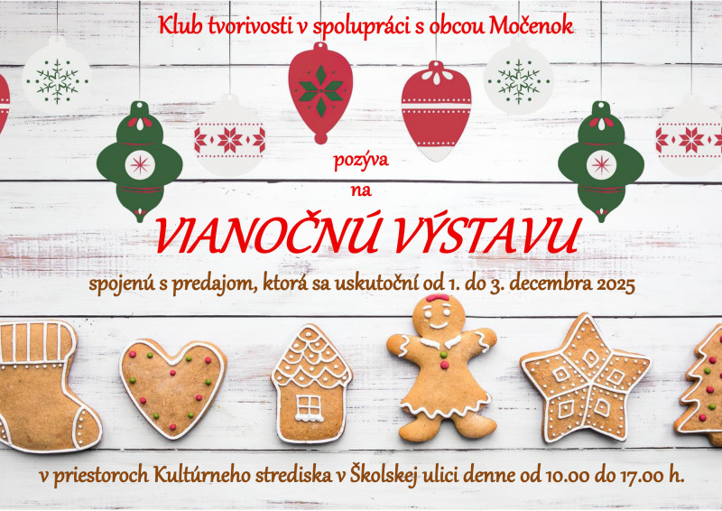 VIANOČNÚ VÝSTAVU spojenú s predajom, ktorá sa uskutoční od 1. do 3. decembra 2025 v priestoroch Kultúrneho strediska v Školskej ulici denne od 10.00 do 17.00 h.