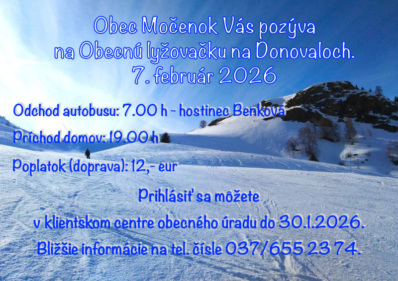 Obec Močenok Vás pozýva na Obecnú lyžovačku na Donovaloch, ktorá sa bude konať v sobotu 7. februára 2026.