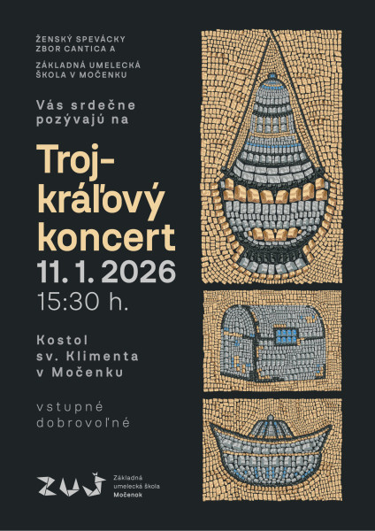 Ženský spevácky zbor Cantica z Močenku a Základná umelecká škola Močenok Vás srdečne pozývajú na Trojkráľový koncert, ktorý sa uskutoční v nedeľu 11.01.2026 o 15:30 hod.  v Kostole sv. Klimenta v Močenku.