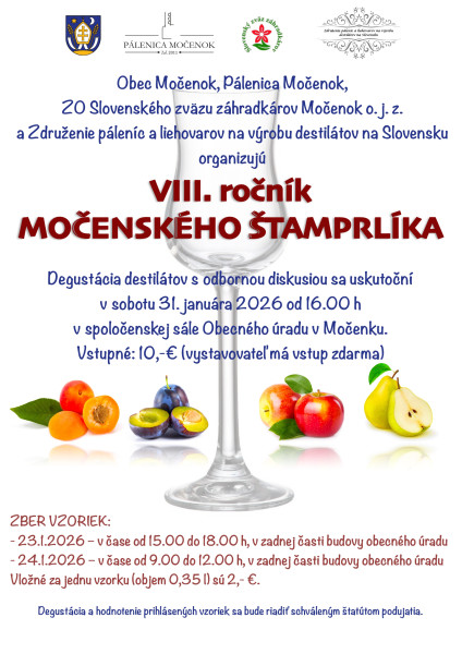 Obec Močenok, Pálenica Močenok, ZO Slovenského zväzu záhradkárov Močenok o. j. z. a Združenie páleníc a liehovarov na výrobu destilátov na Slovensku organizujú VIII. ročník Močenského štamprlíka, ktorý sa uskutoční 31. januára 2026 od 16:00 h v spoločenskej sále Obecného úradu v Močenku.