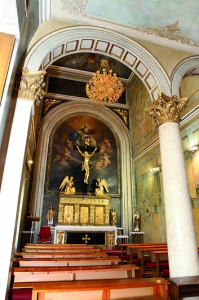 Historicky cennou a esteticky pôsobivou súčasťou kaštieľa je domáca kaplnka s oltárom Sv. Kríža, vysoká 12 metrov. Obloženie jej stien je imitáciou bieleho mramoru. Tri metre vysoký stĺp pod chórom je však už z pravého bieleho mramoru a má korintskú hlavicu. Na oltári je tiež asi trojmetrový kríž z ebonitového dreva. Na stene za ním je veľká maľba, ktorá znázorňuje Boha Otca a Ducha Svätého. Na stuhe v rukách dvoch anjelikov je nápis: „Pater in manus tuas e commendo spritum meum." V preklade to znamená: „Otče, do tvojich rúk porúčam svojho ducha." Tesne pod stropom sú ďalšie štyri vety v latinčine, ktoré v preklade znejú takto: 1. Kríž Kristov je vždy so mnou. 2. Krížu Kristovmu sa vždy klaniam. 3. Kríž Kristov je moje útočište. 4. Kríž Kristov je moja istá spása.