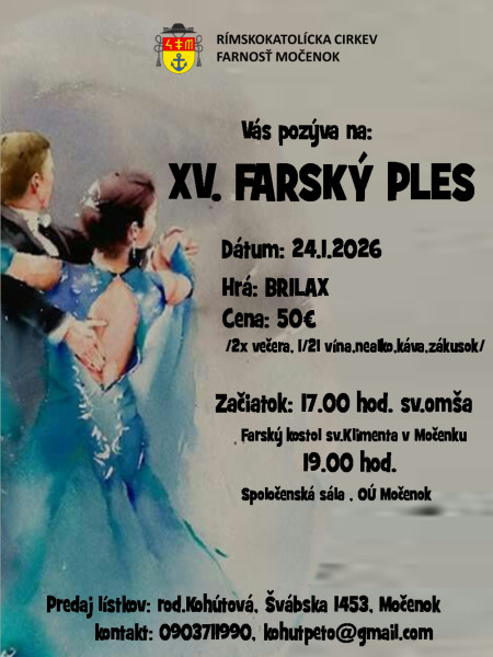 Rímskokatolícka cirkev Farnosť Močenok Vás pozýva na XV. Farský ples, ktorý sa uskutoční 24. januára 2026.