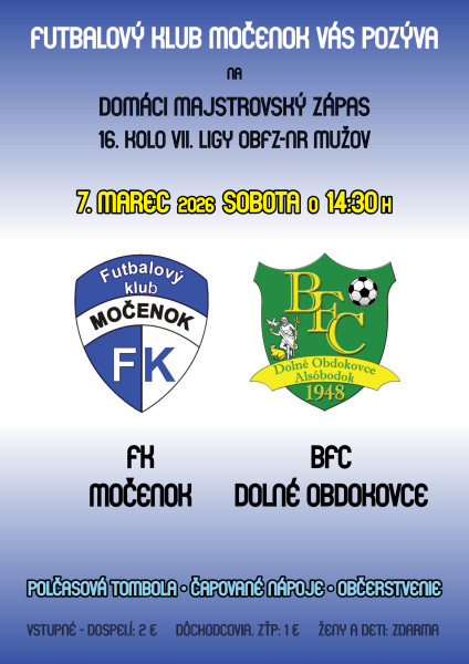 Futbalový klub Močenok vás srdečne pozýva na majstrovské stretnutie A-mužstva, ktoré sa odohrá na domácom štadióne v túto sobotu o 14:30 hod. Súperom Močenka budú futbalisti Dolných Obdokoviec. Tešíme sa na vašu návštevu.