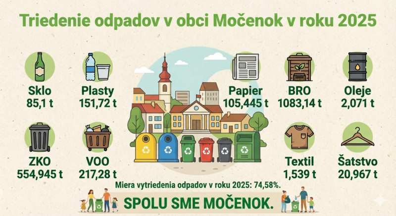 V súlade s § 4 ods. 6) zákona č. 329/2018 Z. z. o poplatkoch za uloženie odpadov a o zmene a doplnení zákona č. 587/2004 Z. z. o Environmentálnom fonde a o zmene a doplnení niektorých zákonov v znení neskorších predpisov obec Močenok predkladá informácie o úrovni a spôsobe výpočtu úrovne vytriedenia komunálnych odpadov za rok 2025 nasledovne (Príloha č. 2 k zákonu č. 329/2018 Z. z.).