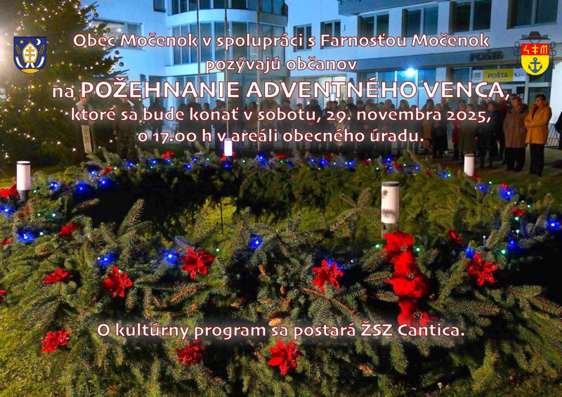 Obec Močenok v spolupráci s Farnosťou Močenok pozývajú občanov na POŽEHNANIE ADVENTNÉHO VENCA, ktoré sa bude konať v sobotu, 29. novembra 2025, o 17.00 h v areáli obecného úradu.