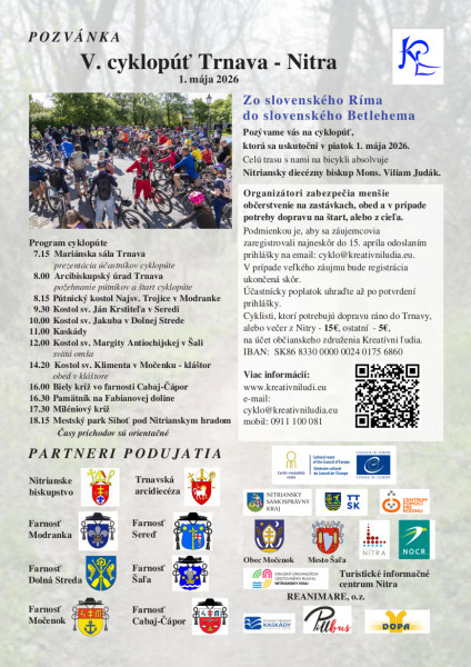 Pozývame Vás na V. ročník cyklopúte Trnava - Močenok - Nitra, ktorá sa uskutoční v piatok 1. mája 2026.