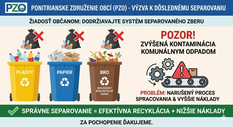 Ponitrianske združenie obcí (PZO) pre separovaný zber a nakladanie s odpadmi žiada občanov, aby dôsledne dodržiavali systém separovaného zberu odpadov (plasty, papier, BRO). V poslednej dobe totiž dochádza k zvýšenému nárastu kontaminácie separovaných zložiek (plasty, papier, BRO) komunálnym odpadom, čo výrazne ovplyvňuje proces spracovania týchto triedených zložiek a navyšuje náklady. Za pochopenie ďakujeme.